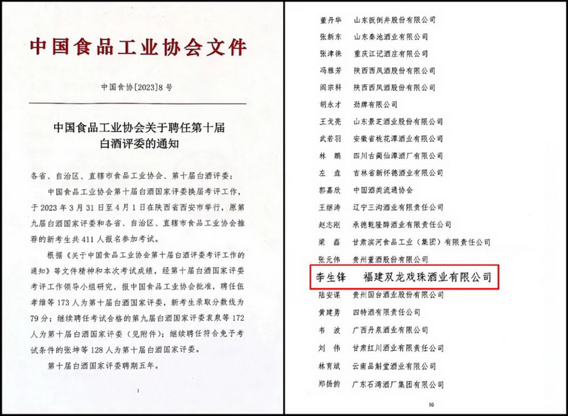近日,中國食品工業(yè)協(xié)會(huì )發(fā)布了《關(guān)于聘任第十屆白酒評委的通知》,雙龍戲珠酒業(yè)技術(shù)總工程師李生鋒通過(guò)層層推薦、選拔、考試,被聘為第十屆國家級白酒評委。