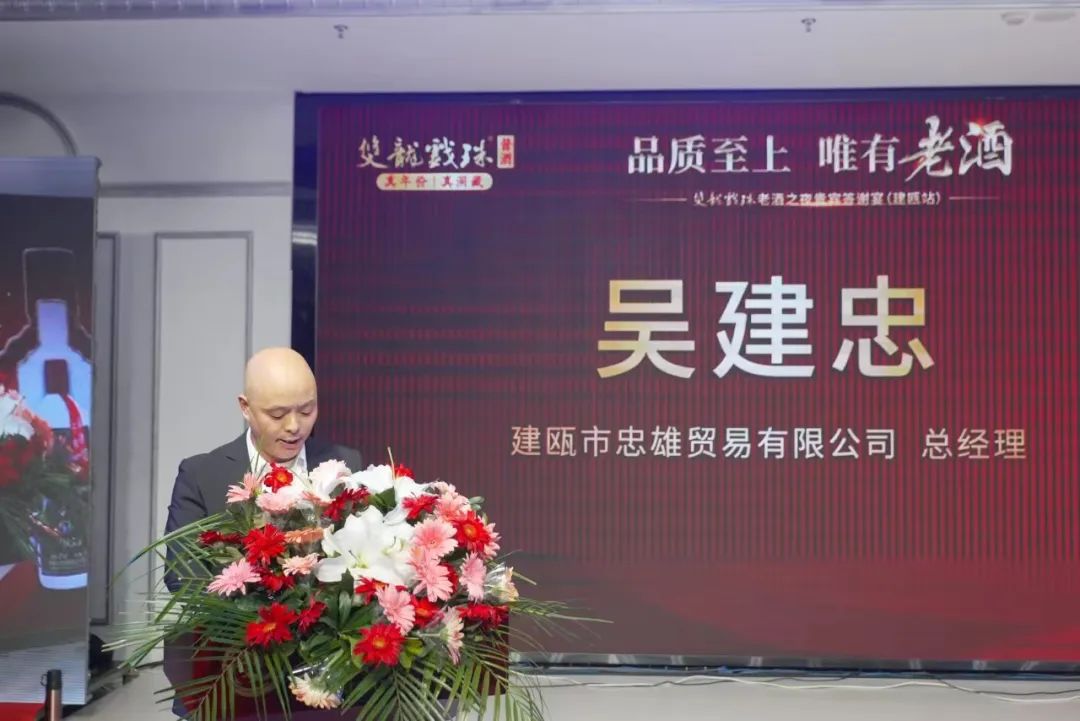 品味醬香,共筑盛宴!11月26日,以“品質(zhì)至上 唯有老酒”為主題的雙龍戲珠老酒之夜貴賓答謝宴(建甌站)在建甌市富貴武夷大酒店隆重舉行。福建雙龍戲珠酒業(yè)有限公司董事長(cháng)黃德鋒、建甌市忠雄貿易有限公司總經(jīng)理吳建忠出席活動(dòng)并致辭。