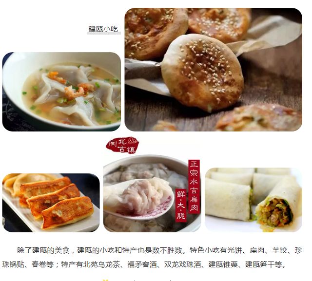 除了建甌的美食,建甌的小吃和特產(chǎn)也是數不勝數。特色小吃有光餅、扁肉、芋餃、珍珠鍋貼、春卷等;特產(chǎn)有北苑烏龍茶、雙龍戲珠酒、建甌錐栗、建甌筍干等。